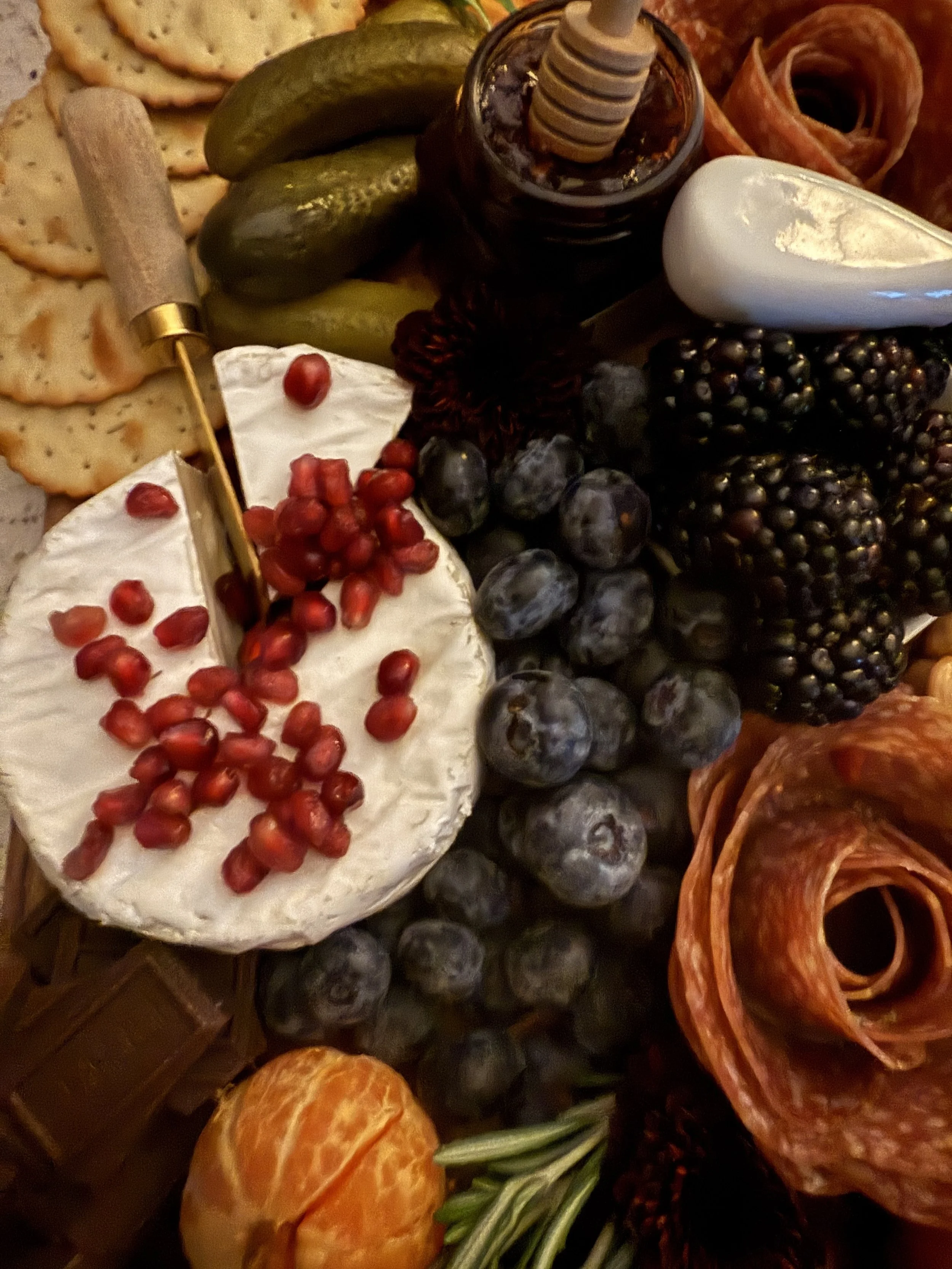 Your grazing board should reflect the mood of the season. Think rich jewel-toned fruits, sprigs of rosemary, pomegranate seeds, sugared cranberries, and golden honeycomb. Layer in seasonal garnishes like cinnamon sticks, dried citrus wheels, or figs for visual interest and cozy appeal.